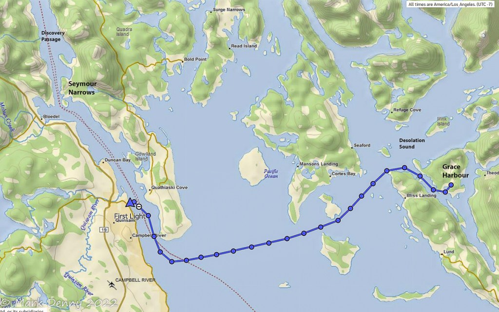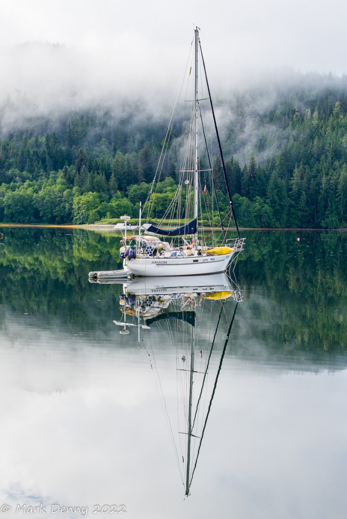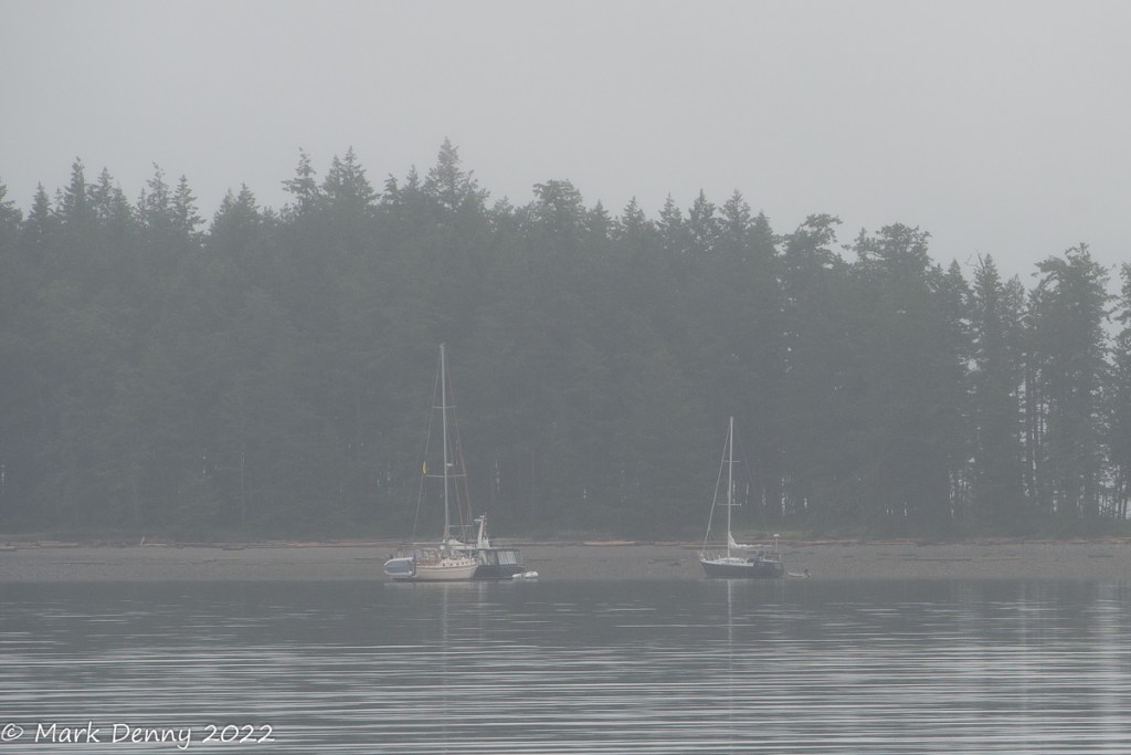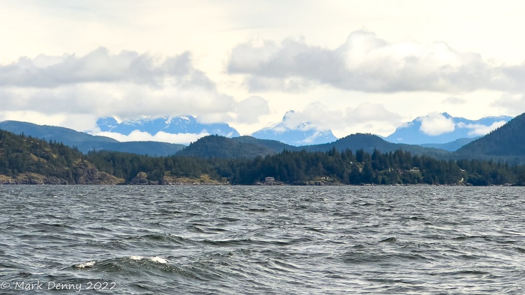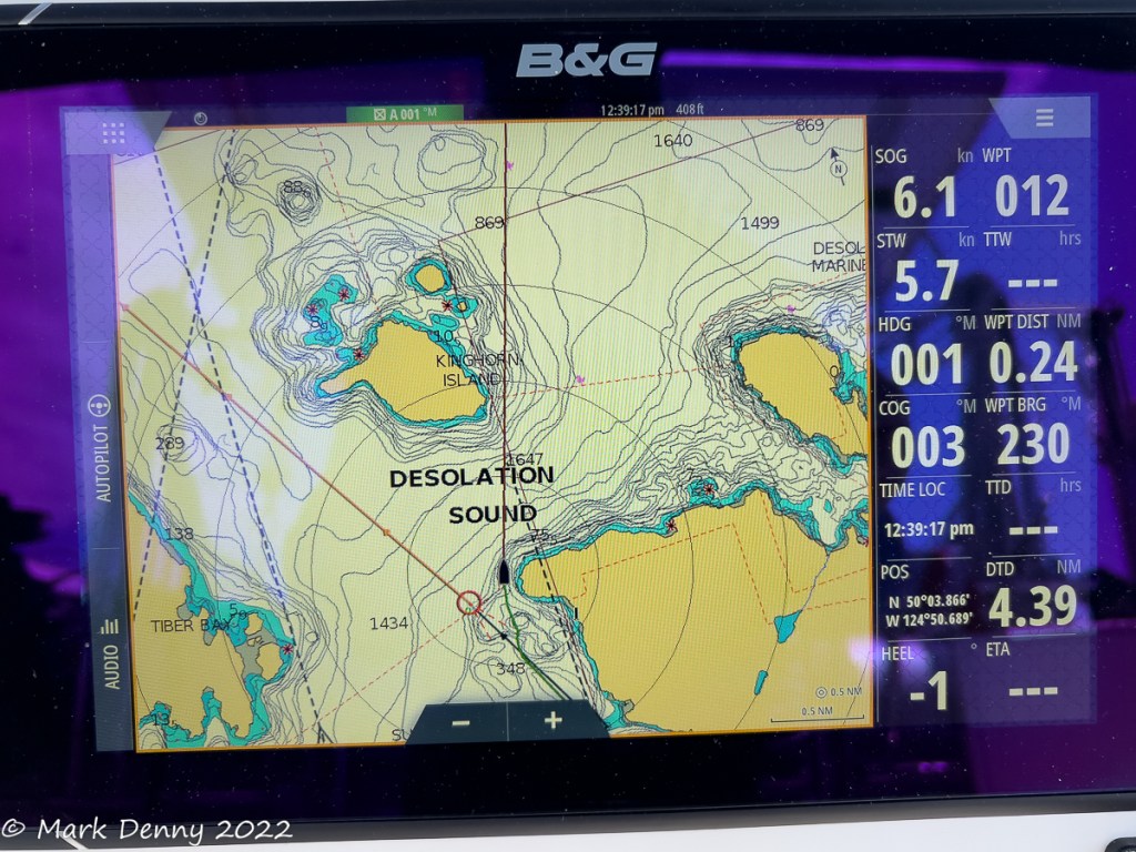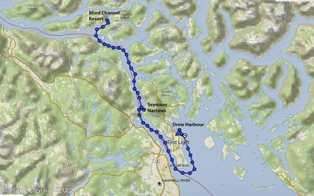 The next morning the wind was blowing 20 – 25 kts. from the NW in Johnstone Strait. The ebb current was against the wind generating waves and a rolling ride. After turning SE in Discovery Passage, the wind lightened to 12-15 kts. and we sailed for a few hours until we reached Plumper Bay. We dropped the sails and circled the bay for an hour waiting for the current to slow in Seymour Narrows. We went through the narrows a bit early and in hindsight we should have waited another half hour. The current against us maxed out at 4.2 kts. And the water was turbulent, so the ride had a bit more excitement than we were looking for.