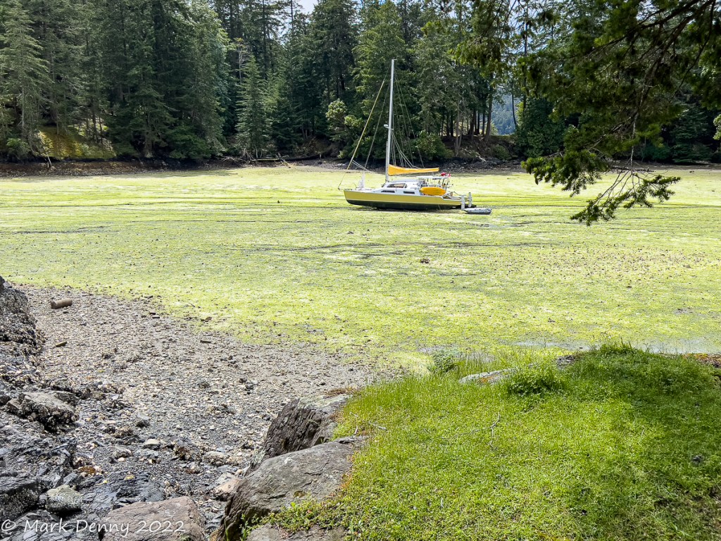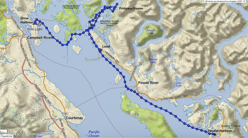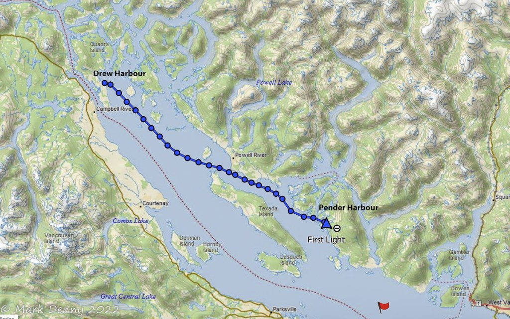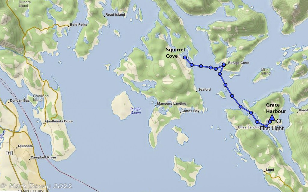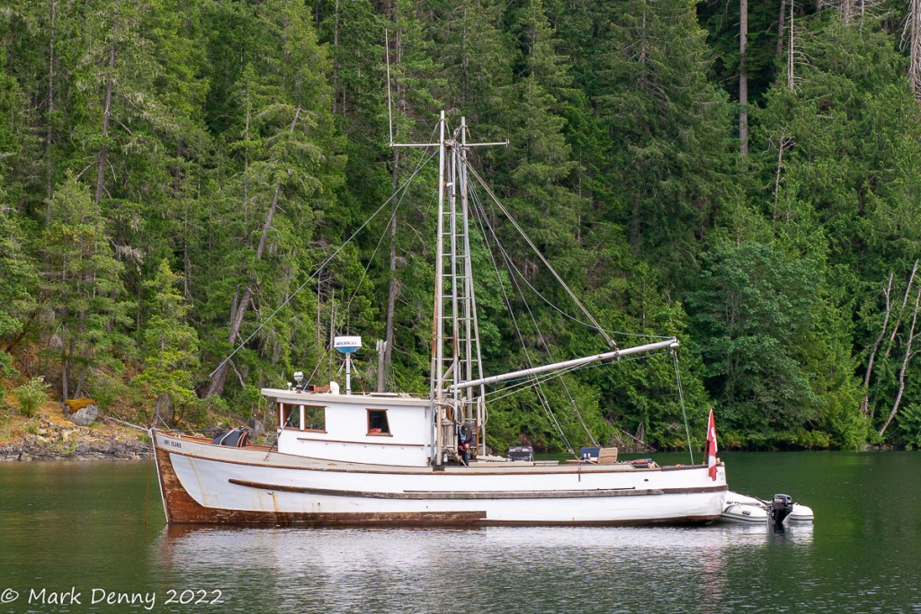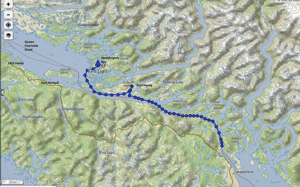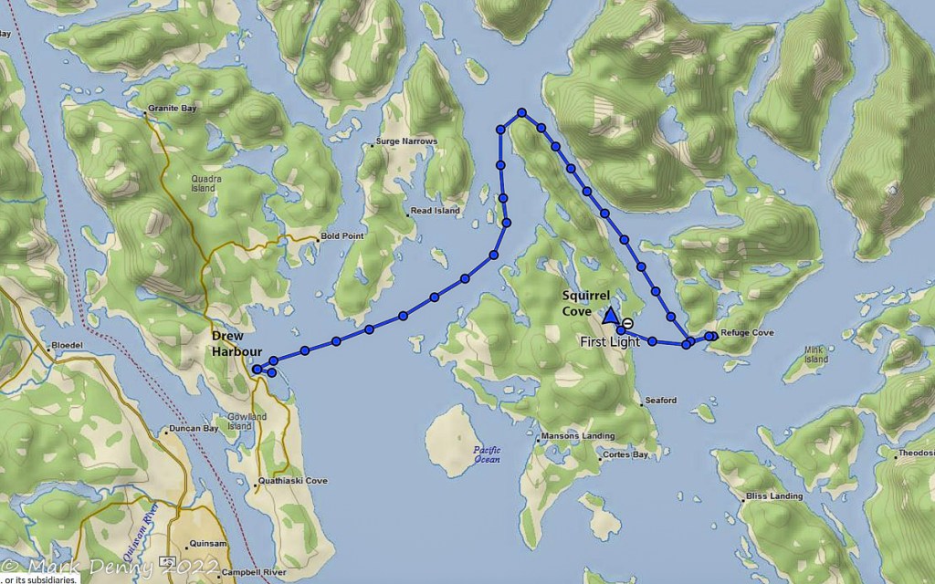 The next morning the wind was blowing 20 – 25 kts. from the NW in Johnstone Strait. The ebb current was against the wind generating waves and a rolling ride. After turning SE in Discovery Passage, the wind lightened to 12-15 kts. and we sailed for a few hours until we reached Plumper Bay. We dropped the sails and circled the bay for an hour waiting for the current to slow in Seymour Narrows. We went through the narrows a bit early and in hindsight we should have waited another half hour. The current against us maxed out at 4.2 kts. And the water was turbulent, so the ride had a bit more excitement than we were looking for.