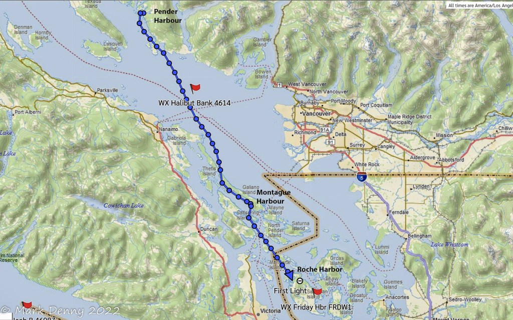 We spent the night and the next day in Drew Harbour. The sun was out, it was warm, it was great. On the way to Pender Harbour we spotted whales several times although they were a fair distance away. After Pender we overnighted at Montague Harbour and the next day, we went to Roche Harbor.